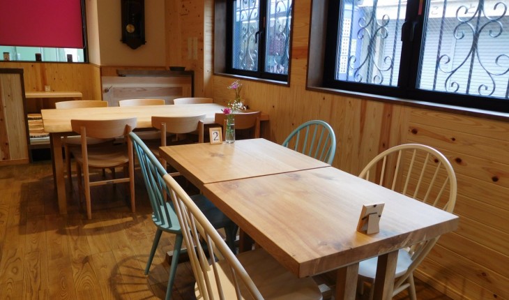 ログハウス風の一戸建て。店内に入ってみると、温かな憩いの空間が目の前に広がっていました。「いらっしゃいませ」、と微笑む店員さん。少々照れくさそうな笑顔からは、お客様に安心と憩いを与えたい、という真心を感じました。優しいオレンジの照明に包まれた店内。木の優しい香りを微かに漂わせる、木製のテーブルとお揃いの椅子。しかし、淡い色の家具の中で存在感を放つ赤と水色の鮮やかな椅子も。友人同士から子連れの親子まで、安心して楽しめる空間になっています。